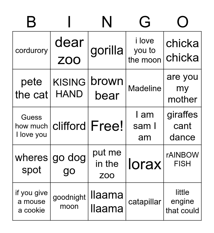 This bingo card has a free space and 24 words: go dog go, goodnight moon, brown bear, if you give a mouse a cookie, chicka chicka, cordurory, pete the cat, dear zoo, I am sam I am, put me in the zoo, Madeline, Guess how much I love you, lorax, rAINBOW FISH, KISING HAND, catapillar, giraffes cant dance, gorilla, are you my mother, clifford, little engine that could, wheres spot, i love you to the moon and llaama llaama.