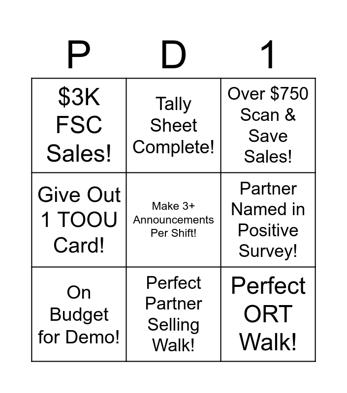 This bingo card has a free space and 11 words: $2K Demo Cart Sales!, Perfect Partner Selling Walk!, Perfect ORT Walk!, On Budget for Demo!, Tally Sheet Complete!, Over $750 Scan & Save Sales!, Partner Named in Positive Survey!, Perfect Paperwork!, Give Out 1 TOOU Card!, $3K FSC Sales! and Follow Wall Notes All Shifts!.
