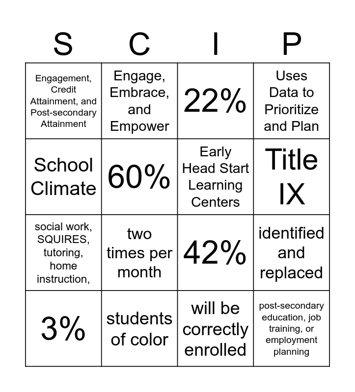 This bingo card has 19 words: 42%, 14 out of 28 seniors needed more than 8 credits, 22%, post-secondary education, job training, or employment planning, identified and replaced, School Climate, will be correctly enrolled, Engagement, Credit Attainment, and Post-secondary Attainment, Engage, Embrace, and Empower, social work, SQUIRES, tutoring, home instruction,, two times per month, 60%, Early Head Start Learning Centers, students of color, 3%, FREE, Uses Data to Prioritize and Plan, Title IX and McKinney-Vento.