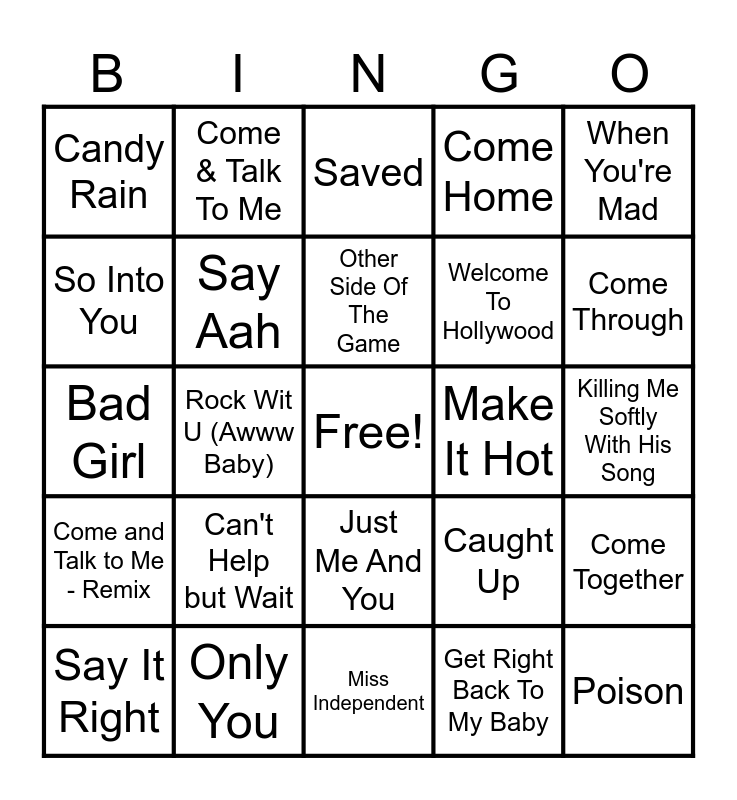 This bingo card has a free space and 93 words: Cranes in the Sky, Knock You Down, Miss Independent, A Long Walk, Epiphany (I'm Leaving), SupaStar, Ex-Factor, Say It Right, Promiscuous, I Changed My Mind, Last Night, Love On Top, Party, Welcome To Hollywood, Take Care, When You're Mad, Saved, One Dance, The Way I Are, Lights Camera Action!, Reminisce, You Remind Me, Love Is All We Need, Gotta Go, Can't Help but Wait, Say Aah, You, Slow Down, Anonymous, Circle, Only You, Just Me And You, Me And Those Dreamin' Eyes, Next Lifetime, Come & Talk To Me, Dance Tonight, Breakdown, Always Be My Baby, Other Side Of The Game, Caught Up, Bad Girl, Come and Talk to Me - Remix, Killing Me Softly With His Song, Can't Get Enough, Poison, Diamonds, MJB Da MVP, Boo'd Up, Maria Maria, Countdown, Pretty Girl Rock, Get Right Back To My Baby, As I Am, Feels Like Summer, Summertime Magic, Faithfully, Stay, Talk, No Guidance, Nothing to Me, Rock Wit U (Awww Baby), Unfoolish, (I Just Want It) To Be Over, Without Me, Slow Down (Remix), Gonna Love Me, Don't Waste My Time, Whoa, So Into You, Better, Girl Like Me, Pick Up Your Feelings, Cheers, Come Home, Are You That Somebody, Go Crazy, Come Through, Come Together, I Don't Wanna, Faded Pictures, Superstar, You Don't Know My Name, Make It Hot, Candy Rain, Sending My Love, Fire In The Sky, Turn Your Lights Down Low, Why Don't We Fall in Love, On Chill (feat. Jeremih), Love's Train, Champagne Life, Got 'Til It's Gone and Funny How Time Flies.