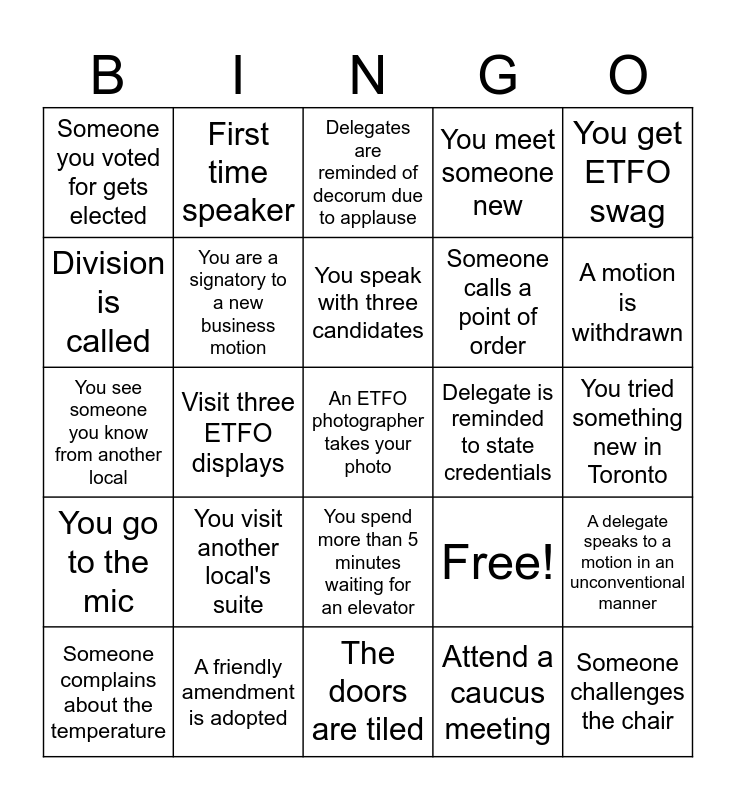 This bingo card has 27 words: Free!, Someone challenges the chair, Someone calls a point of order, The doors are tiled, Division is called, Delegates are reminded of decorum due to applause, First time speaker, You go to the mic, Delegate is reminded to state credentials, A delegate speaks to a motion in an unconventional manner, You see someone you know from another local, You meet someone new, Someone complains about the temperature, A friendly amendment is adopted, A motion is withdrawn, A motion is sent to executive for clarification, You are a signatory to a new business motion, You speak with three candidates, You visit another local's suite, Someone you voted for gets elected, You tried something new in Toronto, Attend a caucus meeting, Visit three ETFO displays, An ETFO photographer takes your photo, You spend more than 5 minutes waiting for an elevator, You get ETFO swag and You visit the OCETFO suite.