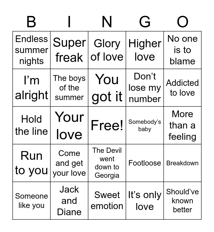 This bingo card has a free space and 59 words: Hurts so good, Jack and Diane, Heaven, Run to you, It’s only love, In your eyes, The boys of the summer, Mandolin rain, Don’t lose my number, In the air tonight, Higher love, Roll with it, I’m alright, I’m free, Learning to fly, Endless summer nights, Should’ve known better, No one is to blame, I’m still standing, You got it, Somebody’s baby, Glory of love, Someone like you, Breakdown, Maneater, Dream on, Bohemian Rhapsody, Africa, Addicted to love, 1999, All night long, Kiss, Thriller, Free fallin, Super freak, September, Everybody wants to rule the world, Your love, Love train, Hold the line, Pour some sugar on me, Come and get your love, More than a feeling, Don’t stop till you get enough, Roxanne, Carry on wayward son, Stayin alive, One of these nights, The Devil went down to Georgia, Sweet emotion, Off the wall, La grange, Two tickets to Paradise, Mississippi Queen, If this is it, Footloose, Danger zone, Never gonna give you up and Broken wings.