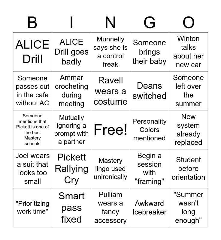 This bingo card has a free space and 24 words: "Prioritizing work time", Pickett Rallying Cry, Ravell wears a costume, Awkward Icebreaker, Winton talks about her new car, ALICE Drill, ALICE Drill goes badly, Munnelly says she is a control freak, Personality Colors mentioned, New system already replaced, Someone mentions that Pickett is one of the best Mastery schools, Ammar crocheting during meeting, Begin a session with "framing", Student before orientation, Someone passes out in the cafe without AC, Smart pass fixed, Pulliam wears a fancy accessory, Someone brings their baby, Someone left over the summer, Joel wears a suit that looks too small, Mutually ignoring a prompt with a partner, Mastery lingo used unironically, Deans switched and "Summer wasn't long enough".