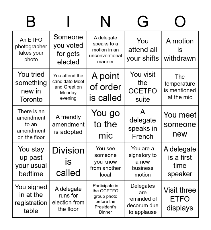 This bingo card has 42 words: The chair is challenged, A point of order is called, The doors are tiled, Division is called, Delegates are reminded of decorum due to applause, A delegate is a first time speaker, You go to the mic, A delegate is reminded to state credentials, A delegate speaks to a motion in an unconventional manner, You see someone you know from another local, You meet someone new, The temperature is mentioned at the mic, A friendly amendment is adopted, A motion is withdrawn, A motion is sent to executive for clarification, You are a signatory to a new business motion, You speak with three candidates, There is an amendment to an amendment on the floor, You visit another local's suite, Someone you voted for gets elected, You tried something new in Toronto, Attend a caucus meeting, Visit three ETFO displays, An ETFO photographer takes your photo, You spend more than 5 minutes waiting for an elevator, You get ETFO swag, You visit the OCETFO suite, You do something tourist-y in Toronto, Point of personal privilege is called, A delegate calls to question, A kerfuffle with the subtitles occurs, You stay up past your usual bedtime, You attend the candidate Meet and Greet on Monday evening, Participate in the OCETFO group photo before the President's Dinner, You danced, You signed in at the registration table, A delegate runs for election from the floor, A delegate speaks in French, A delegate speaks in a traditional Indigenous language, You sing, You attend all your shifts and The same delegate speaks more than 4 times in the same session.