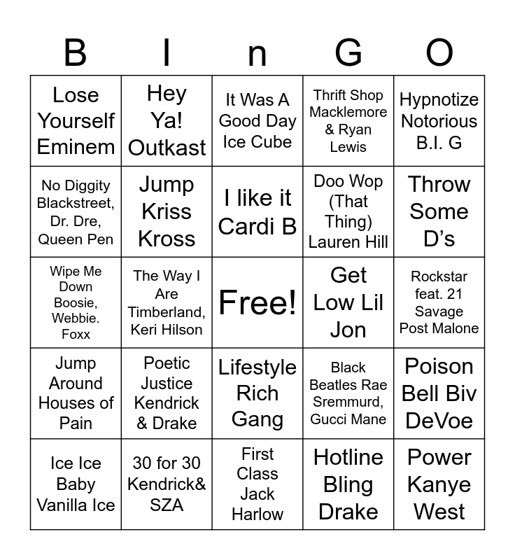 This bingo card has a free space and 34 words: One Dance Drake, Wizkid, Kyla, Hotline Bling Drake, Push It Salt & Pepa, Moment for Life Niki Minaj & Drake, Jump Around Houses of Pain, Jump Kriss Kross, Hypnotize Notorious B.I. G, Ice Ice Baby Vanilla Ice, Hey Ya! Outkast, Gangsta Paradise Coolio, I like it Cardi B, It Was A Good Day Ice Cube, Fight the power, Lolliop Lil Wayne, Get Low Lil Jon, Throw Some D’s, 30 for 30 Kendrick& SZA, Wipe Me Down Boosie, Webbie. Foxx, Poetic Justice Kendrick & Drake, Black Beatles Rae Sremmurd, Gucci Mane, Lifestyle Rich Gang, Through The Wire Kanye West, Lose Yourself Eminem, Rockstar feat. 21 Savage Post Malone, First Class Jack Harlow, Power Kanye West, Thrift Shop Macklemore & Ryan Lewis, The Next Episode Dr. Dre, Snoop Dogg, Doo Wop (That Thing) Lauren Hill, No Diggity Blackstreet, Dr. Dre, Queen Pen, Day ‘N’ Nite Kid Cudi, The Way I Are Timberland, Keri Hilson, Poison Bell Biv DeVoe and It was a Good Day Ice Cube.