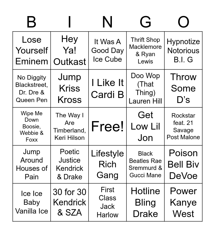 This bingo card has a free space and 34 words: One Dance Drake, Wizkid & Kyla, Hotline Bling Drake, Push It Salt & Pepa, Moment for Life Niki Minaj & Drake, Jump Around Houses of Pain, Jump Kriss Kross, Hypnotize Notorious B.I. G, Ice Ice Baby Vanilla Ice, Hey Ya! Outkast, Gangsta Paradise Coolio, I Like It Cardi B, It Was A Good Day Ice Cube, Fight The Power Public Enemy, Lolliop Lil Wayne, Get Low Lil Jon, Throw Some D’s, 30 for 30 Kendrick & SZA, Wipe Me Down Boosie, Webbie & Foxx, Poetic Justice Kendrick & Drake, Black Beatles Rae Sremmurd & Gucci Mane, Lifestyle Rich Gang, Through The Wire Kanye West, Lose Yourself Eminem, Rockstar feat. 21 Savage Post Malone, First Class Jack Harlow, Power Kanye West, Thrift Shop Macklemore & Ryan Lewis, The Next Episode Dr. Dre, Snoop Dogg, Doo Wop (That Thing) Lauren Hill, No Diggity Blackstreet, Dr. Dre & Queen Pen, Day ‘N’ Nite Kid Cudi, The Way I Are Timberland, Keri Hilson, Poison Bell Biv DeVoe and It was a Good Day Ice Cube.
