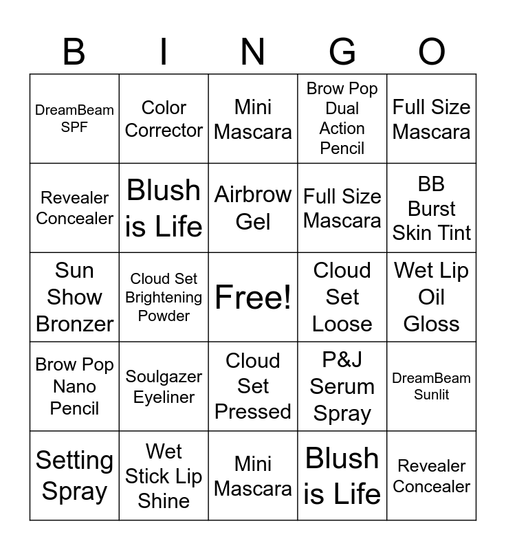 This bingo card has a free space and 25 words: Soulgazer Eyeliner, Mini Mascara, Airbrow Gel, Setting Spray, Full Size Mascara, DreamBeam SPF, Revealer Concealer, Color Corrector, Cloud Set Loose, Cloud Set Pressed, Full Size Mascara, Sun Show Bronzer, P&J Serum Spray, DreamBeam Sunlit, Blush is Life, Revealer Foundation, Wet Lip Oil Gloss, Mini Mascara, BB Burst Skin Tint, Cloud Set Brightening Powder, Revealer Concealer, Wet Stick Lip Shine, Brow Pop Nano Pencil, Brow Pop Dual Action Pencil and Blush is Life.