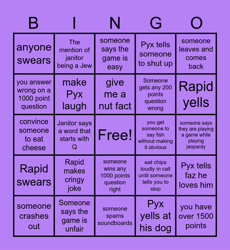 This bingo card has a free space and 24 words: Rapid makes cringy joke, Someone says the game is unfair, give me a nut fact, someone crashes out, someone leaves and comes back, anyone swears, you answer wrong on a 1000 point question, The mention of janitor being a Jew, you get someone to say fish without making it obvious, someone wins any 1000 points question right, Someone gets any 200 points question wrong, convince someone to eat cheese, eat chips loudly in call until someone tells you to stop, Pyx tells faz he loves him, make Pyx laugh, Pyx yells at his dog, someone says they are playing a game while playing jeopardy, someone says the game is easy, Rapid yells, Janitor says a word that starts with Q, you have over 1500 points, Rapid swears, Pyx tells someone to shut up and someone spams soundboards.