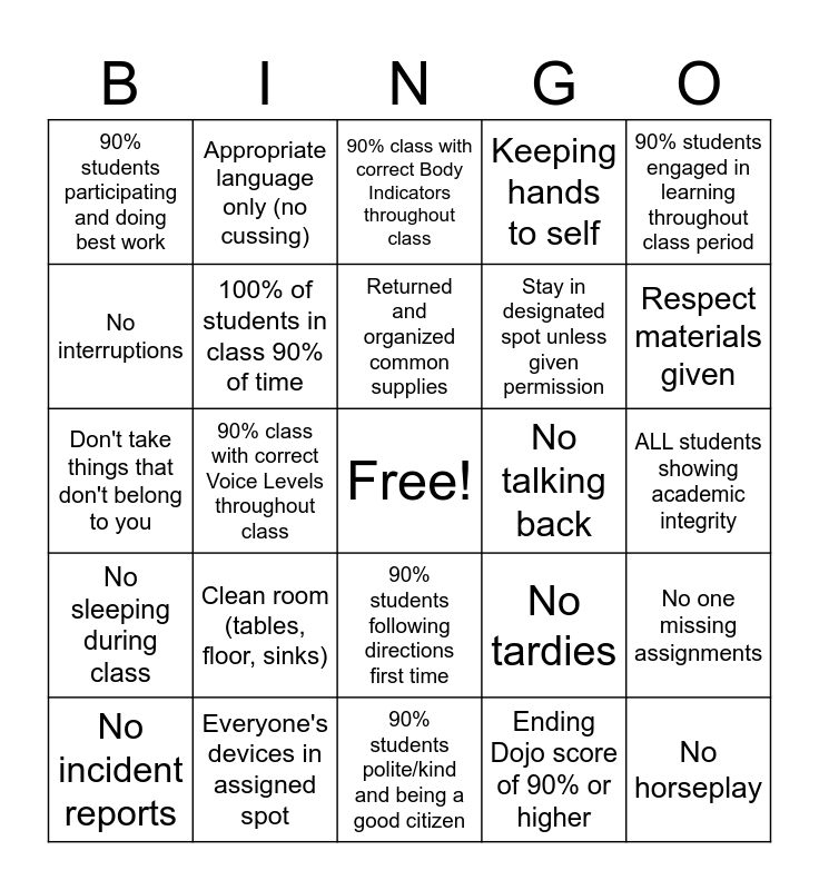 This bingo card has a free space and 24 words: Clean room (tables, floor, sinks), Everyone's devices in assigned spot, Returned and organized common supplies, No incident reports, 90% students engaged in learning throughout class period, 90% students participating and doing best work, No interruptions, Appropriate language only (no cussing), No talking back, 90% students following directions first time, Stay in designated spot unless given permission, Don't take things that don't belong to you, No tardies, No one missing assignments, 100% of students in class 90% of time, Ending Dojo score of 90% or higher, ALL students showing academic integrity, 90% class with correct Body Indicators throughout class, Respect materials given, 90% class with correct Voice Levels throughout class, No horseplay, No sleeping during class, Keeping hands to self and 90% students polite/kind and being a good citizen.