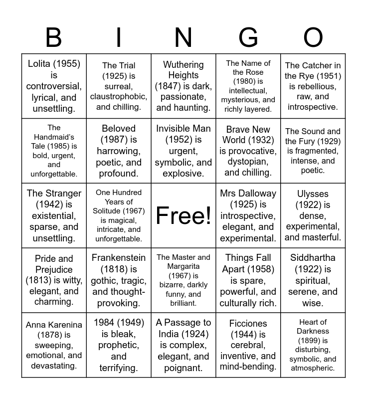 This bingo card has a free space and 33 words: The Great Gatsby (1925) is haunting, lyrical, and tragic., To Kill a Mockingbird (1960) is powerful, compassionate, and unflinching., One Hundred Years of Solitude (1967) is magical, intricate, and unforgettable., Crime and Punishment (1866) is brooding, philosophical, and intense., Pride and Prejudice (1813) is witty, elegant, and charming., Beloved (1987) is harrowing, poetic, and profound., The Catcher in the Rye (1951) is rebellious, raw, and introspective., Anna Karenina (1878) is sweeping, emotional, and devastating., The Trial (1925) is surreal, claustrophobic, and chilling., Jane Eyre (1847) is fierce, romantic, and defiant., Invisible Man (1952) is urgent, symbolic, and explosive., Wuthering Heights (1847) is dark, passionate, and haunting., Don Quixote (1605) is imaginative, satirical, and enduring., The Brothers Karamazov (1880) is spiritual, intellectual, and gripping., Mrs Dalloway (1925) is introspective, elegant, and experimental., The Sound and the Fury (1929) is fragmented, intense, and poetic., 1984 (1949) is bleak, prophetic, and terrifying., The Stranger (1942) is existential, sparse, and unsettling., Frankenstein (1818) is gothic, tragic, and thought-provoking., Things Fall Apart (1958) is spare, powerful, and culturally rich., The Master and Margarita (1967) is bizarre, darkly funny, and brilliant., Middlemarch (1871) is nuanced, wise, and deeply human., Lolita (1955) is controversial, lyrical, and unsettling., Ulysses (1922) is dense, experimental, and masterful., A Passage to India (1924) is complex, elegant, and poignant., Heart of Darkness (1899) is disturbing, symbolic, and atmospheric., The Name of the Rose (1980) is intellectual, mysterious, and richly layered., Brave New World (1932) is provocative, dystopian, and chilling., The Handmaid’s Tale (1985) is bold, urgent, and unforgettable., Siddhartha (1922) is spiritual, serene, and wise., The Grapes of Wrath (1939) is epic, gritty, and socially conscious., Ficciones (1944) is cerebral, inventive, and mind-bending. and A Tale of Two Cities (1859) is dramatic, historical, and emotionally charged..