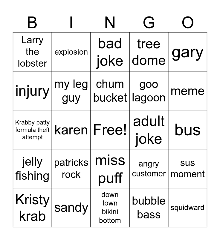 This bingo card has a free space and 24 words: patricks rock, sandy, chum bucket, Kristy krab, gary, Larry the lobster, injury, explosion, adult joke, miss puff, goo lagoon, Krabby patty formula theft attempt, angry customer, sus moment, my leg guy, bubble bass, bus, bad joke, meme, karen, squidward, jelly fishing, tree dome and down town bikini bottom.