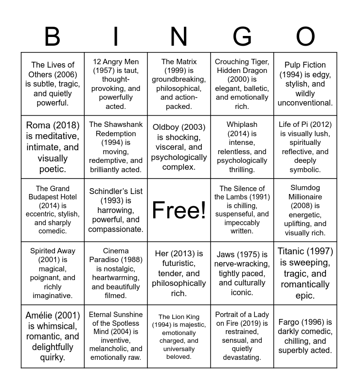 This bingo card has a free space and 33 words: The Godfather (1972) is intense, masterful, and unforgettable., Parasite (2019) is gripping, unsettling, and socially astute., Schindler’s List (1993) is harrowing, powerful, and compassionate., Inception (2010) is cerebral, inventive, and visually stunning., Spirited Away (2001) is magical, poignant, and richly imaginative., The Shawshank Redemption (1994) is moving, redemptive, and brilliantly acted., Pulp Fiction (1994) is edgy, stylish, and wildly unconventional., Amélie (2001) is whimsical, romantic, and delightfully quirky., 12 Angry Men (1957) is taut, thought-provoking, and powerfully acted., Casablanca (1942) is timeless, elegant, and emotionally resonant., Oldboy (2003) is shocking, visceral, and psychologically complex., The Matrix (1999) is groundbreaking, philosophical, and action-packed., La La Land (2016) is vibrant, bittersweet, and gorgeously filmed., Pan’s Labyrinth (2006) is haunting, fantastical, and politically charged., The Silence of the Lambs (1991) is chilling, suspenseful, and impeccably written., Life of Pi (2012) is visually lush, spiritually reflective, and deeply symbolic., Eternal Sunshine of the Spotless Mind (2004) is inventive, melancholic, and emotionally raw., The Grand Budapest Hotel (2014) is eccentric, stylish, and sharply comedic., Cinema Paradiso (1988) is nostalgic, heartwarming, and beautifully filmed., Jaws (1975) is nerve-wracking, tightly paced, and culturally iconic., Her (2013) is futuristic, tender, and philosophically rich., The Dark Knight (2008) is gripping, morally complex, and brilliantly executed., The Lives of Others (2006) is subtle, tragic, and quietly powerful., Slumdog Millionaire (2008) is energetic, uplifting, and visually rich., The Lion King (1994) is majestic, emotionally charged, and universally beloved., Fargo (1996) is darkly comedic, chilling, and superbly acted., Crouching Tiger, Hidden Dragon (2000) is elegant, balletic, and emotionally rich., Whiplash (2014) is intense, relentless, and psychologically thrilling., Roma (2018) is meditative, intimate, and visually poetic., Titanic (1997) is sweeping, tragic, and romantically epic., The Truman Show (1998) is clever, unsettling, and poignantly satirical., Portrait of a Lady on Fire (2019) is restrained, sensual, and quietly devastating. and The Farewell (2019) is touching, culturally insightful, and subtly humorous..