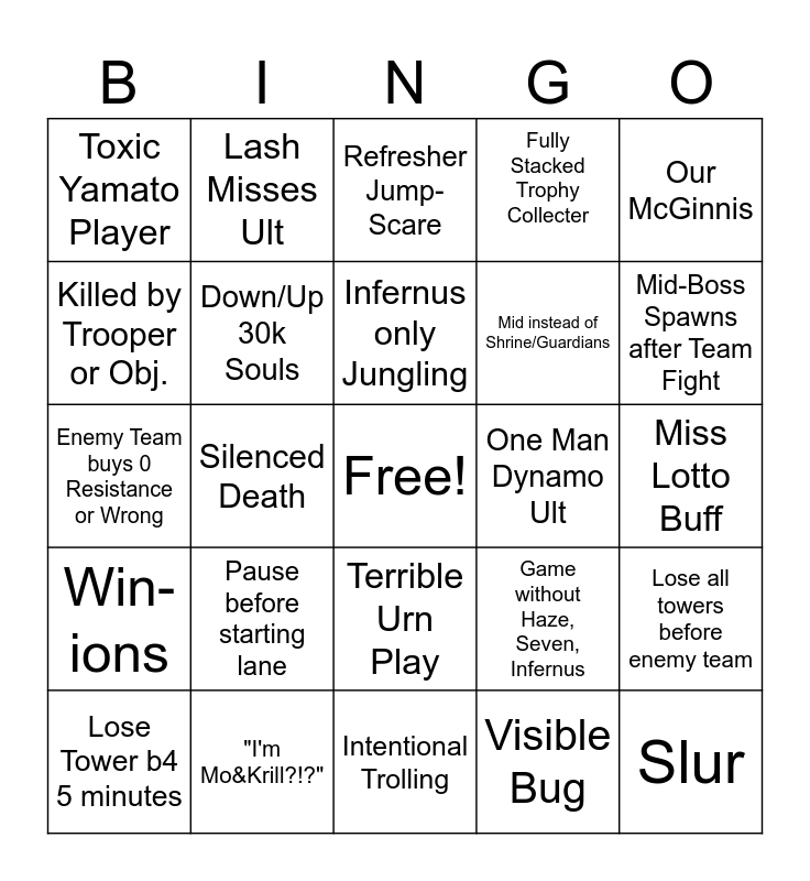 This bingo card has a free space and 24 words: Pause before starting lane, "I'm Mo&Krill?!?", Infernus only Jungling, Lose Tower b4 5 minutes, Our McGinnis, Toxic Yamato Player, Killed by Trooper or Obj., Lash Misses Ult, One Man Dynamo Ult, Terrible Urn Play, Mid instead of Shrine/Guardians, Enemy Team buys 0 Resistance or Wrong, Game without Haze, Seven, Infernus, Lose all towers before enemy team, Down/Up 30k Souls, Visible Bug, Miss Lotto Buff, Refresher Jump-Scare, Mid-Boss Spawns after Team Fight, Silenced Death, Slur, Win-ions, Fully Stacked Trophy Collecter and Intentional Trolling.