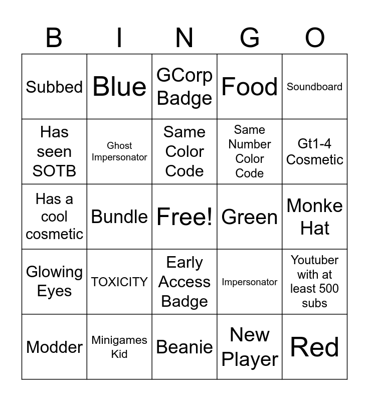 This bingo card has a free space and 24 words: TOXICITY, Minigames Kid, Same Color Code, Modder, Soundboard, Subbed, Has seen SOTB, Blue, Green, Early Access Badge, Same Number Color Code, Has a cool cosmetic, Impersonator, Youtuber with at least 500 subs, Ghost Impersonator, New Player, Monke Hat, GCorp Badge, Gt1-4 Cosmetic, Bundle, Red, Glowing Eyes, Food and Beanie.