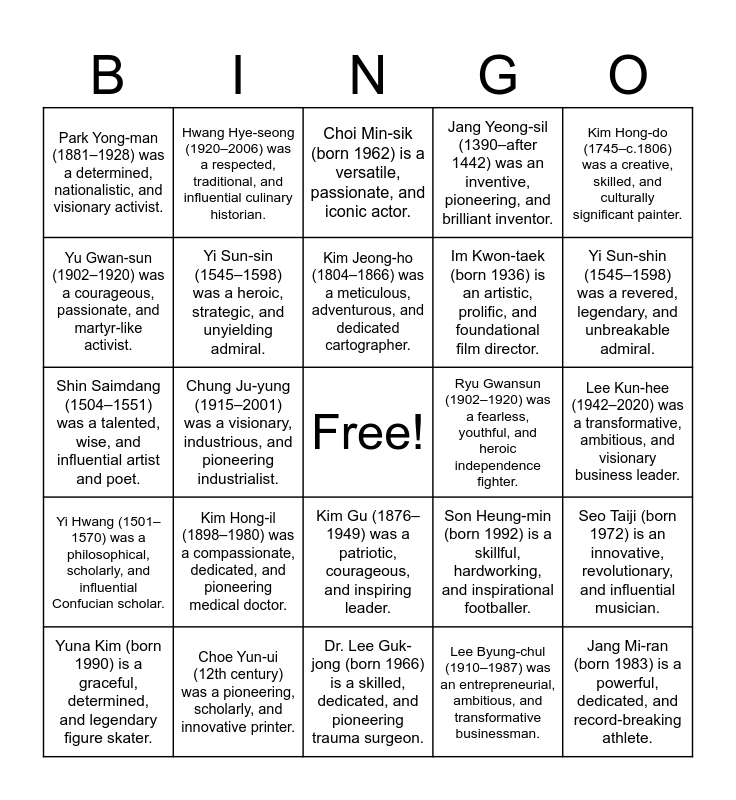 This bingo card has a free space and 35 words: Jeong Yak-yong (1762–1836) was an intellectual, reformist, and philosophical thinker., Na Hye-sok (1896–1948) was a pioneering, bold, and multifaceted artist., Sejong the Great (1397–1450) was a visionary, scholarly, and benevolent king., Yi Sun-sin (1545–1598) was a heroic, strategic, and unyielding admiral., Kim Gu (1876–1949) was a patriotic, courageous, and inspiring leader., Jang Yeong-sil (1390–after 1442) was an inventive, pioneering, and brilliant inventor., Yu Gwan-sun (1902–1920) was a courageous, passionate, and martyr-like activist., Heo Jun (1539–1615) was a compassionate, knowledgeable, and groundbreaking physician., Kim Jeong-ho (1804–1866) was a meticulous, adventurous, and dedicated cartographer., Na Hye-sok (1896–1948) was a pioneering, artistic, and feminist writer., Shin Saimdang (1504–1551) was a talented, wise, and influential artist and poet., Kim Hong-do (1745–c.1806) was a creative, skilled, and culturally significant painter., Yun Dong-ju (1917–1945) was a poetic, resilient, and heartfelt poet., Choi Yong-sool (1904–1986) was a disciplined, innovative, and foundational martial artist., Park Yong-man (1881–1928) was a determined, nationalistic, and visionary activist., Ryu Gwansun (1902–1920) was a fearless, youthful, and heroic independence fighter., Lee Byung-chul (1910–1987) was an entrepreneurial, ambitious, and transformative businessman., Chung Ju-yung (1915–2001) was a visionary, industrious, and pioneering industrialist., Yi Hwang (1501–1570) was a philosophical, scholarly, and influential Confucian scholar., Jang Mi-ran (born 1983) is a powerful, dedicated, and record-breaking athlete., Son Heung-min (born 1992) is a skillful, hardworking, and inspirational footballer., Yuna Kim (born 1990) is a graceful, determined, and legendary figure skater., Seo Taiji (born 1972) is an innovative, revolutionary, and influential musician., Choe Yun-ui (12th century) was a pioneering, scholarly, and innovative printer., Choi Min-sik (born 1962) is a versatile, passionate, and iconic actor., Yi Sun-shin (1545–1598) was a revered, legendary, and unbreakable admiral., Kim Woo-jung (1936–2019) was an industrious, visionary, and philanthropic entrepreneur., Kim Eun-jung (born 1981) is a resilient, competitive, and celebrated athlete., Im Kwon-taek (born 1936) is an artistic, prolific, and foundational film director., Lee Kun-hee (1942–2020) was a transformative, ambitious, and visionary business leader., Han Kang (born 1970) is a literary, profound, and evocative writer., Dr. Lee Guk-jong (born 1966) is a skilled, dedicated, and pioneering trauma surgeon., Kim Hong-il (1898–1980) was a compassionate, dedicated, and pioneering medical doctor., Hwang Hye-seong (1920–2006) was a respected, traditional, and influential culinary historian. and Park Chung-hee (1917–1979) was a controversial, transformative, and determined military leader and president..
