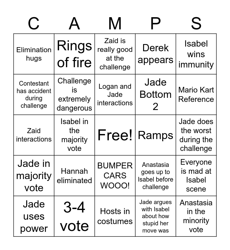This bingo card has a free space and 24 words: Hannah eliminated, 3-4 vote, Logan and Jade interactions, Jade uses power, Isabel wins immunity, Elimination hugs, Contestant has accident during challenge, Rings of fire, Ramps, BUMPER CARS WOOO!, Jade Bottom 2, Zaid interactions, Anastasia goes up to Isabel before challenge, Everyone is mad at Isabel scene, Challenge is extremely dangerous, Jade argues with Isabel about how stupid her move was, Jade does the worst during the challenge, Zaid is really good at the challenge, Mario Kart Reference, Isabel in the majority vote, Anastasia in the minority vote, Jade in majority vote, Derek appears and Hosts in costumes.