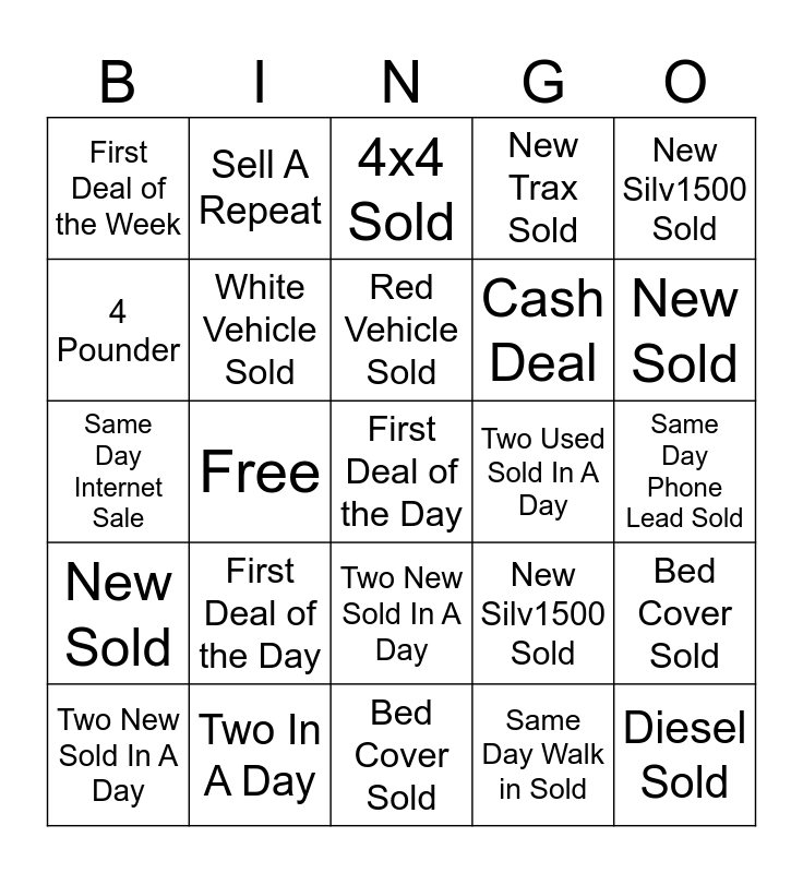 This bingo card has 58 words: Same Day Phone Lead Sold, Two In A Day, Black Vehicle Sold, New Sold, Same Day Walk in Sold, One New/One Used Sold in One Day, White Vehicle Sold, Retired DRAC Sold, Cash Deal, Sale Fully Protected, New Trax Sold, New Trailblazer Sold, Diesel Sold, Free, Same Day Internet Sale, First Deal of the Week, First Deal of the Day, New Silv1500 Sold, 3 Referrals on 1 Deal, Red Vehicle Sold, Two Used Sold In A Day, 4x4 Sold, Two New Sold In A Day, Bed Cover Sold, Hit Your Goal, Same Day Phone Lead Sold, Two In A Day, Black Vehicle Sold, New Sold, Same Day Walk in Sold, One New/One Used Sold in One Day, White Vehicle Sold, Retired DRAC Sold, Cash Deal, Sale Fully Protected, New Trax Sold, New Trailblazer Sold, Free, Same Day Internet Sale, First Deal of the Week, First Deal of the Day, Diesel Sold, New Silv1500 Sold, 3 Referrals on 1 Deal, Red Vehicle Sold, Two Used Sold In A Day, 4x4 Sold, Two New Sold In A Day, Bed Cover Sold, Hit Your Goal, Lease Deal, Google Review, Avg 1 Created Appt per Day, Hat Trick, Sell A Repeat, 4 VSC Sold, 4 Pounder and 5 Pounder.