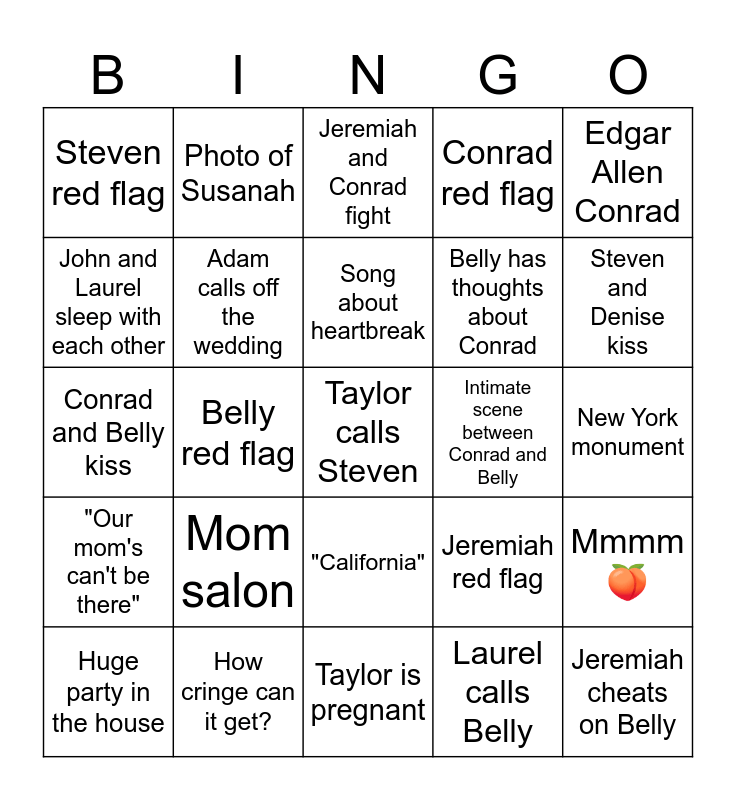 This bingo card has 25 words: Mom salon, Taylor is pregnant, Song about heartbreak, Huge party in the house, Edgar Allen Conrad, Steven red flag, John and Laurel sleep with each other, Photo of Susanah, Intimate scene between Conrad and Belly, "California", Belly has thoughts about Conrad, Conrad and Belly kiss, Jeremiah red flag, Mmmm 🍑, Adam calls off the wedding, Jeremiah cheats on Belly, New York monument, Jeremiah and Conrad fight, Steven and Denise kiss, Belly red flag, Taylor calls Steven, How cringe can it get?, "Our mom's can't be there", Conrad red flag and Laurel calls Belly.
