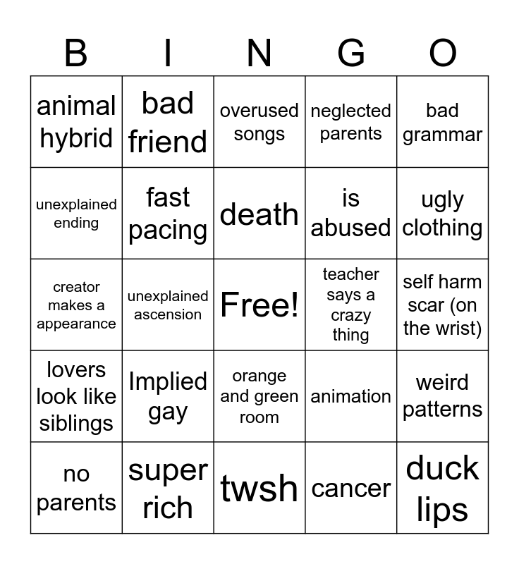 This bingo card has a free space and 24 words: Implied gay, super rich, death, no parents, bad grammar, animal hybrid, unexplained ending, bad friend, teacher says a crazy thing, orange and green room, is abused, creator makes a appearance, animation, weird patterns, fast pacing, cancer, self harm scar (on the wrist), overused songs, ugly clothing, unexplained ascension, duck lips, lovers look like siblings, neglected parents and twsh.