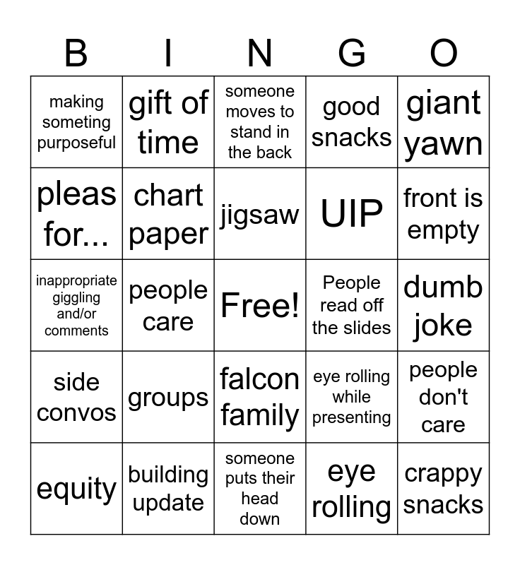This bingo card has a free space and 34 words: paper plates, eye rolling, something incorrect during presentation, runs over time, side convos, chart paper, giant yawn, equity, gift of time, late people, jigsaw, someone moves to stand in the back, ice breakers, annoying question, People read off the slides, front is empty, building update, inappropriate giggling and/or comments, groups, eye rolling while presenting, falcon family, differentiation, making someting purposeful, dumb joke, someone puts their head down, crappy snacks, good snacks, data, UIP, pleas for..., district comes to welcome us back, people care, people don't care and new people.