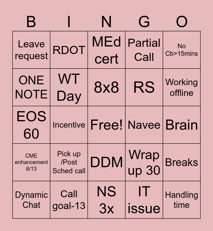 This bingo card has a free space and 24 words: Pick up /Post Sched call, Call goal-13, 8x8, Dynamic Chat, No Cb>15mins, Leave request, ONE NOTE, RDOT, Navee, DDM, RS, EOS 60, Wrap up 30, Breaks, WT Day, IT issue, Brain, MEd cert, Working offline, Incentive, Handling time, CME enhancement 8/13, Partial Call and NS 3x.