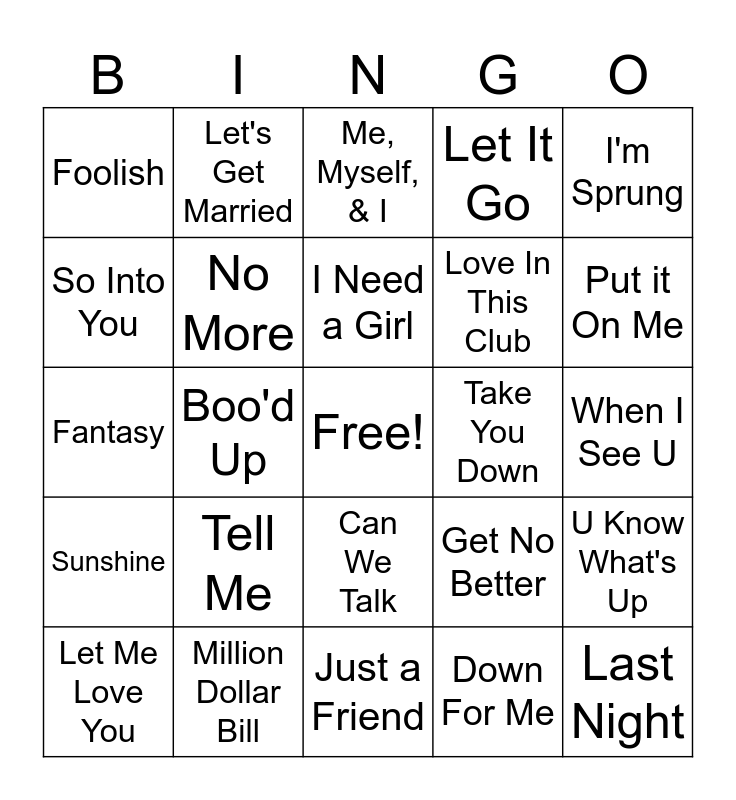 This bingo card has a free space and 24 words: Tell Me, Million Dollar Bill, I Need a Girl, Let Me Love You, I'm Sprung, Foolish, So Into You, Let's Get Married, Take You Down, Can We Talk, Love In This Club, Fantasy, Get No Better, U Know What's Up, No More, Down For Me, When I See U, Me, Myself, & I, Put it On Me, Boo'd Up, Last Night, Sunshine, Let It Go and Just a Friend.