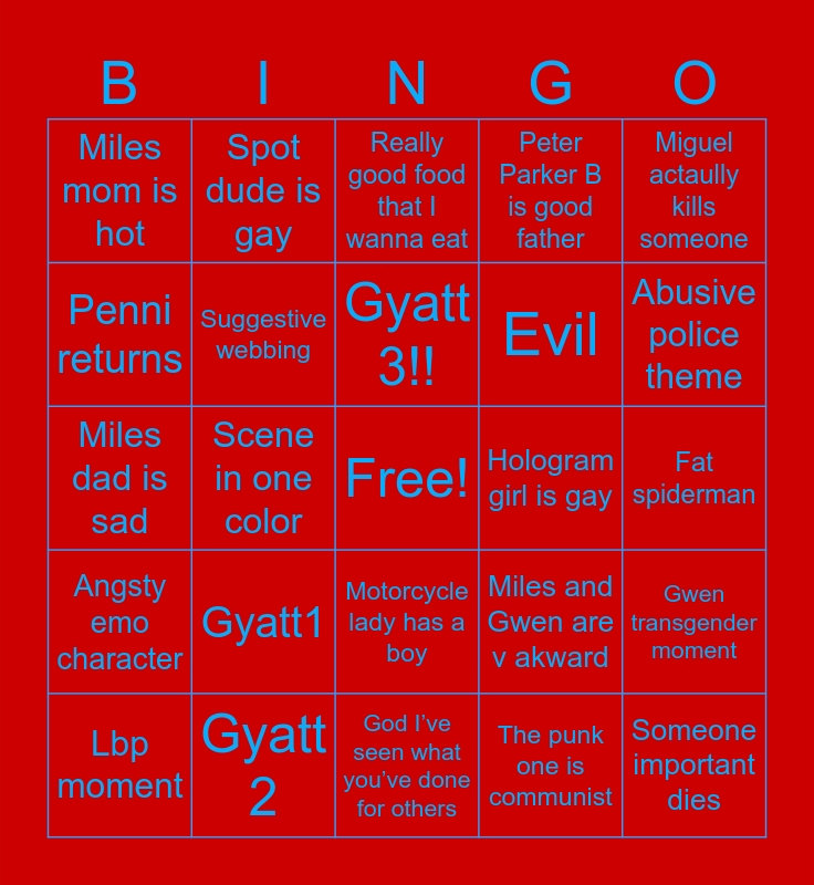 This bingo card has a free space and 24 words: Gyatt1, Gyatt 2, Gyatt 3!!, Lbp moment, Miguel actaully kills someone, Miles mom is hot, Penni returns, Spot dude is gay, Hologram girl is gay, Motorcycle lady has a boy, Evil, Miles dad is sad, Miles and Gwen are v akward, Gwen transgender moment, Suggestive webbing, The punk one is communist, Fat spiderman, Really good food that I wanna eat, Abusive police theme, Scene in one color, Someone important dies, Angsty emo character, Peter Parker B is good father and God I’ve seen what you’ve done for others.