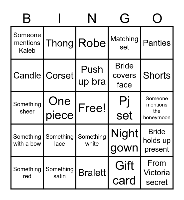 This bingo card has a free space and 29 words: Something red, Bride laughs, One piece, Bride tries to hide a gift, Someone mentions Kaleb, Robe, Corset, Something lace, Pj set, Something satin, Someone mentions the honeymoon, From Victoria secret, Bralett, Gift card, Shorts, Bride gets Embarrassed, Something white, Something with a bow, Panties, Something sheer, Night gown, Something black, Bride covers face, Candle, Matching set, Thong, Bride holds up present, Push up bra and Bride says something is cute.