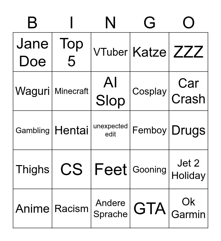 This bingo card has a free space and 24 words: CS, Racism, AI Slop, Anime, ZZZ, Jane Doe, Waguri, Top 5, Femboy, Feet, Cosplay, Gambling, Gooning, Jet 2 Holiday, Minecraft, GTA, Drugs, VTuber, Car Crash, Hentai, Ok Garmin, Thighs, Katze and Andere Sprache.