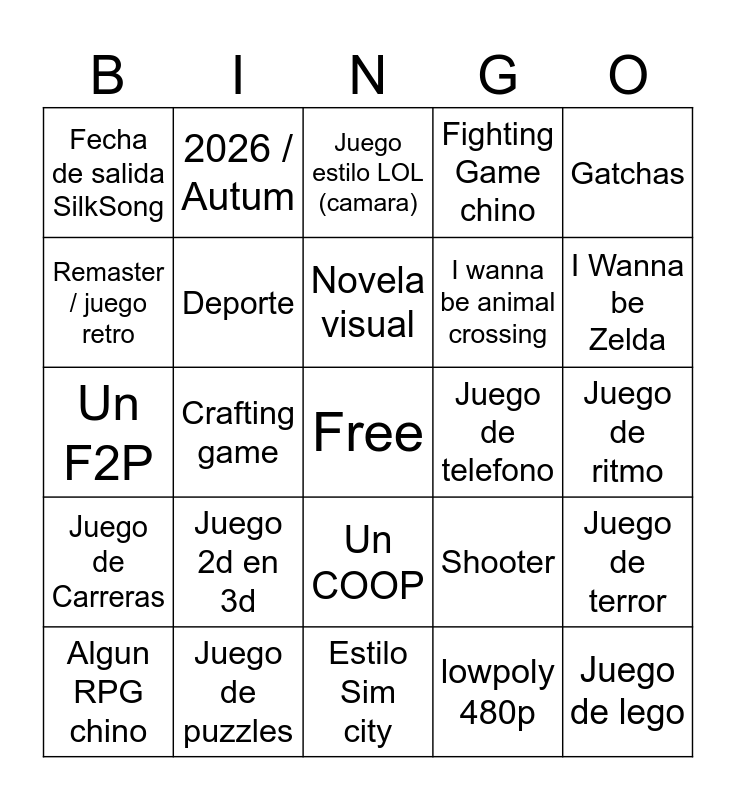 This bingo card has a free space and 24 words: Juego 2d en 3d, Juego de puzzles, Novela visual, Algun RPG chino, Gatchas, Fecha de salida SilkSong, Remaster / juego retro, 2026 / Autum, Juego de telefono, Un COOP, I wanna be animal crossing, Un F2P, Shooter, Juego de terror, Deporte, lowpoly 480p, Juego de ritmo, Juego estilo LOL (camara), I Wanna be Zelda, Crafting game, Juego de lego, Juego de Carreras, Fighting Game chino and Estilo Sim city.