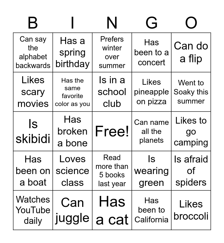 This bingo card has a free space and 24 words: Loves science class, Can juggle, Is in a school club, Watches YouTube daily, Can do a flip, Can say the alphabet backwards, Likes scary movies, Has a spring birthday, Can name all the planets, Read more than 5 books last year, Likes pineapple on pizza, Is skibidi, Is wearing green, Is afraid of spiders, Has the same favorite color as you, Has been to California, Likes to go camping, Prefers winter over summer, Went to Soaky this summer, Has broken a bone, Likes broccoli, Has been on a boat, Has been to a concert and Has a cat.
