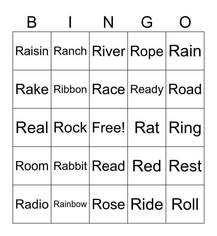 This bingo card has a free space and 24 words: Rabbit, Rainbow, Race, Radio, Rain, Raisin, Rake, Ranch, Rat, Read, Ready, Real, Red, Rest, Ribbon, Ride, Ring, River, Road, Rock, Roll, Room, Rope and Rose.