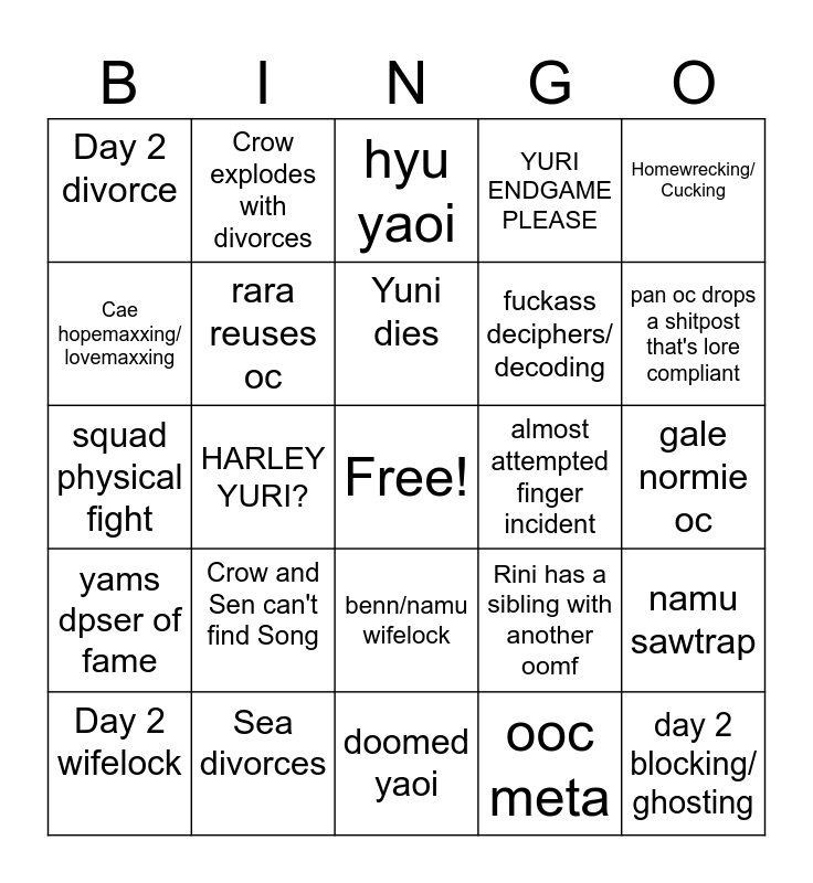 This bingo card has a free space and 24 words: Crow and Sen can't find Song, Sea divorces, Yuni dies, Day 2 wifelock, Homewrecking/ Cucking, Day 2 divorce, Cae hopemaxxing/ lovemaxxing, Crow explodes with divorces, almost attempted finger incident, benn/namu wifelock, fuckass deciphers/ decoding, squad physical fight, Rini has a sibling with another oomf, namu sawtrap, rara reuses oc, ooc meta, gale normie oc, hyu yaoi, pan oc drops a shitpost that's lore compliant, HARLEY YURI?, day 2 blocking/ ghosting, yams dpser of fame, YURI ENDGAME PLEASE and doomed yaoi.