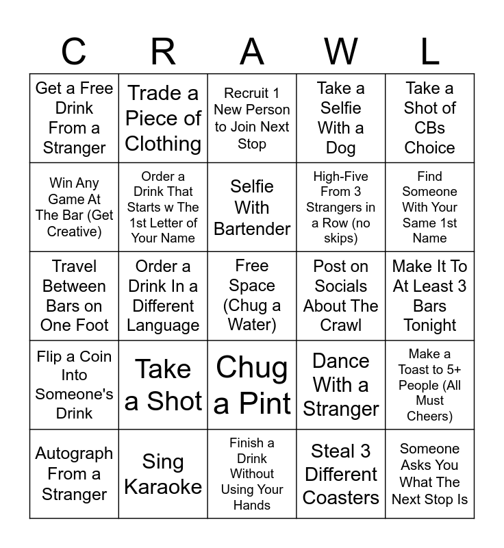 This bingo card has a free space and 24 words: Take a Shot, Sing Karaoke, Selfie With Bartender, Autograph From a Stranger, Take a Shot of CBs Choice, Get a Free Drink From a Stranger, Win Any Game At The Bar (Get Creative), Trade a Piece of Clothing, Post on Socials About The Crawl, Chug a Pint, High-Five From 3 Strangers in a Row (no skips), Travel Between Bars on One Foot, Dance With a Stranger, Make a Toast to 5+ People (All Must Cheers), Order a Drink That Starts w The 1st Letter of Your Name, Steal 3 Different Coasters, Make It To At Least 3 Bars Tonight, Recruit 1 New Person to Join Next Stop, Find Someone With Your Same 1st Name, Order a Drink In a Different Language, Someone Asks You What The Next Stop Is, Flip a Coin Into Someone's Drink, Take a Selfie With a Dog and Finish a Drink Without Using Your Hands.