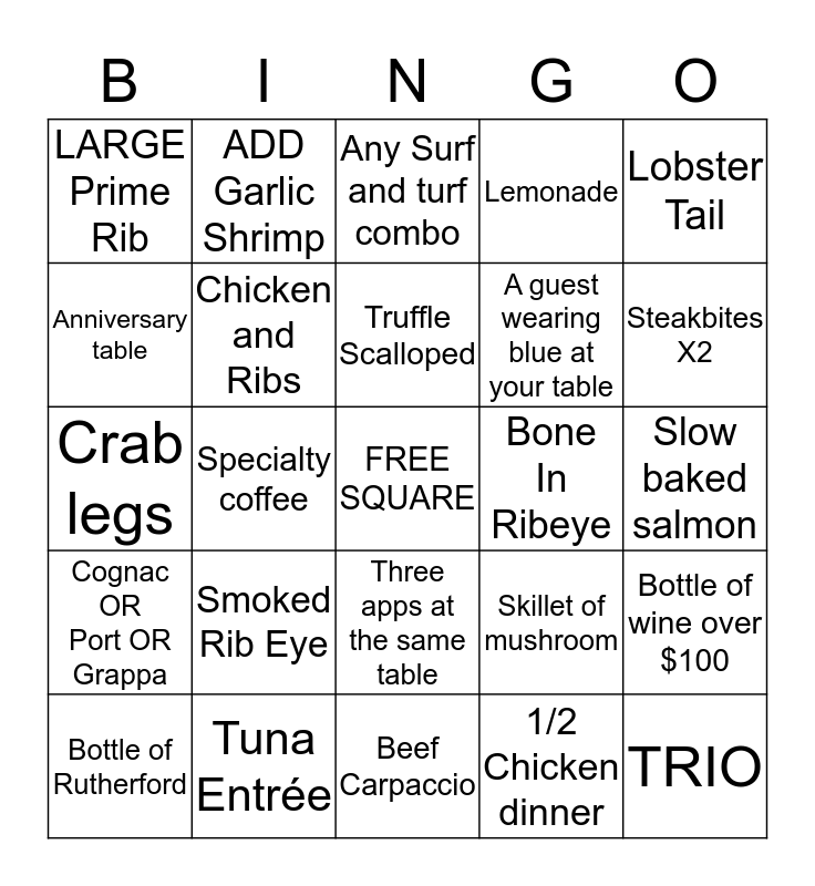 This bingo card has a free space and 24 words: Smoked Rib Eye, Tuna Entrée, Truffle Scalloped, Bottle of Rutherford, Lobster Tail, LARGE Prime Rib, Anniversary table, ADD Garlic Shrimp, Bone In Ribeye, Three apps at the same table, A guest wearing blue at your table, Crab legs, Skillet of mushroom, Bottle of wine over $100, Chicken and Ribs, 1/2 Chicken dinner, Slow baked salmon, Any Surf and turf combo, Steakbites X2, Specialty coffee, TRIO, Cognac OR Port OR Grappa, Lemonade and Beef Carpaccio.