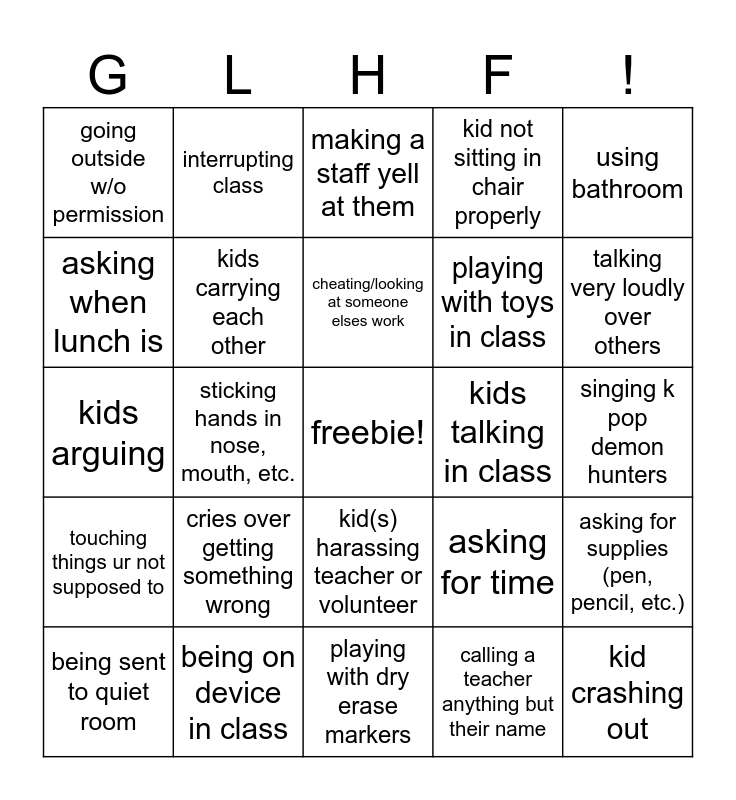 This bingo card has a free space and 24 words: cries over getting something wrong, being on device in class, cheating/looking at someone elses work, being sent to quiet room, using bathroom, going outside w/o permission, asking when lunch is, interrupting class, kids talking in class, kid(s) harassing teacher or volunteer, playing with toys in class, kids arguing, asking for time, asking for supplies (pen, pencil, etc.), kids carrying each other, calling a teacher anything but their name, singing k pop demon hunters, making a staff yell at them, talking very loudly over others, sticking hands in nose, mouth, etc., kid crashing out, touching things ur not supposed to, kid not sitting in chair properly and playing with dry erase markers.