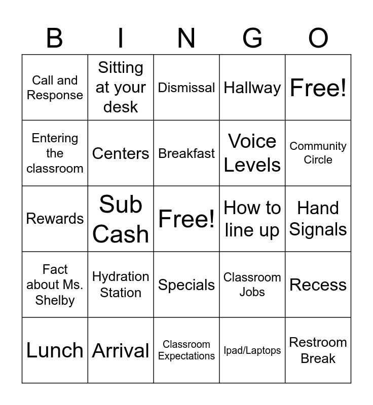 This bingo card has a free space and 24 words: Hydration Station, Arrival, Breakfast, Lunch, Free!, Call and Response, Entering the classroom, Sitting at your desk, How to line up, Specials, Voice Levels, Rewards, Classroom Jobs, Recess, Centers, Ipad/Laptops, Hand Signals, Dismissal, Community Circle, Sub Cash, Restroom Break, Fact about Ms. Shelby, Hallway and Classroom Expectations.