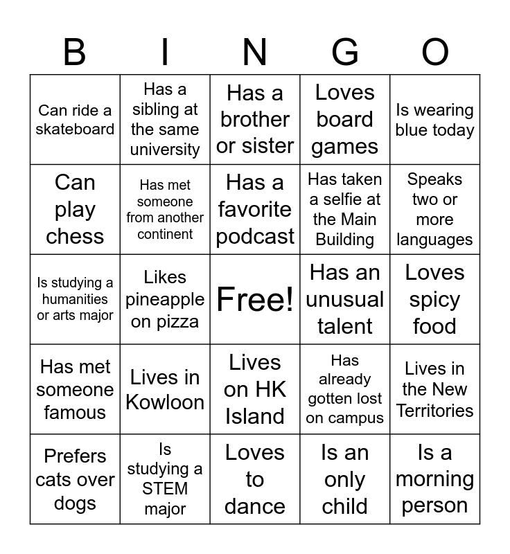 This bingo card has a free space and 49 words: Knows how to do magic tricks, Is a morning person, Likes to go hiking or biking, Loves to dance, Lives in Kowloon, Has taken public transportation to campus, Has a sibling at the same university, Has already found a favorite place to eat on or near campus, Can play chess, Knows the name of the university president, Has met someone from another continent, Loves board games, Lives in the New Territories, Has already gotten lost on campus, Has the same major as you, Has a birthday in the same month as you, Has a favorite podcast, Has an unusual talent, Has a pet, Is wearing blue today, Likes pineapple on pizza, Is an only child, Can ride a skateboard, Has taken a selfie at the Main Building, Prefers dogs over cats, Speaks two or more languages, Prefers cats over dogs, Has a part-time job, Lives on HK Island, Has met someone famous, Owns university merch (t-shirt, hoodie, etc.), Has a food allergy, Plays video games regularly, Has traveled to more than three countries, Is studying a STEM major, Is left-handed, Enjoys photography, Likes instant noodles, Loves spicy food, Collects something unusual, Can cook at least one meal from scratch, Knows how to swim, Plays a musical instrument, Has a creative hobby (art, writing, music, etc.), Is studying a humanities or arts major, Has a brother or sister, Loves coffee or tea, Can name three campus landmarks and Is vegetarian or vegan.