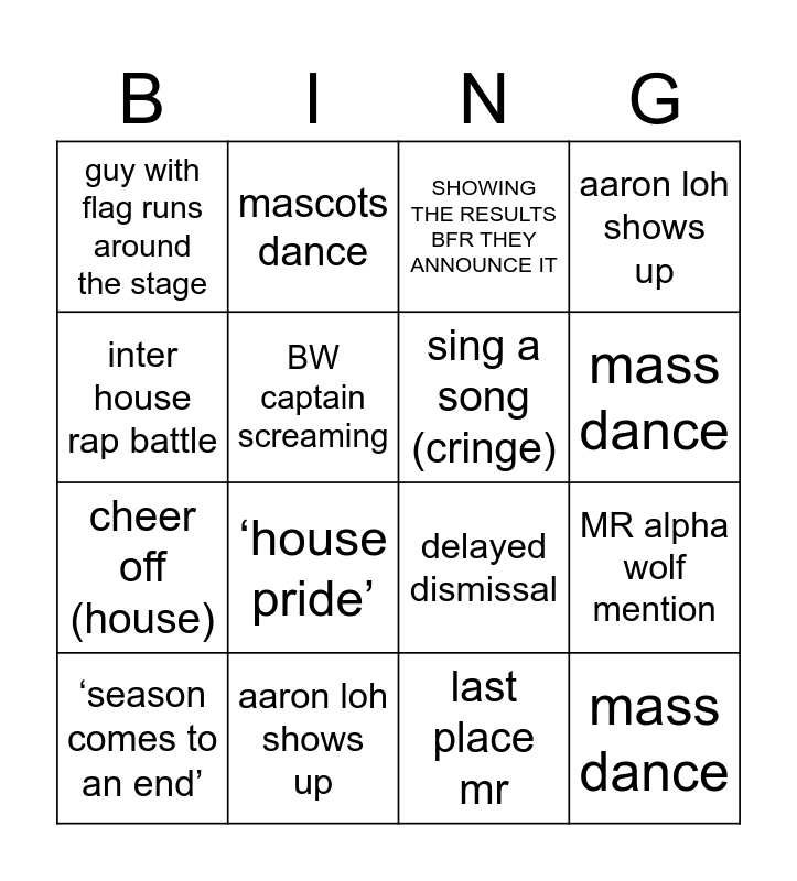 This bingo card has 20 words: MR alpha wolf mention, technical difficulties, SHOWING THE RESULTS BFR THEY ANNOUNCE IT, bomb game, ‘season comes to an end’, inter house rap battle, aaron loh shows up, guy with flag runs around the stage, cheer off (house), mascots dance, ‘house pride’, delayed dismissal, BW captain screaming, mass dance, sing a song (cringe), school cheer, mass dance, aaron loh shows up, last place mr and delayed dismissal.