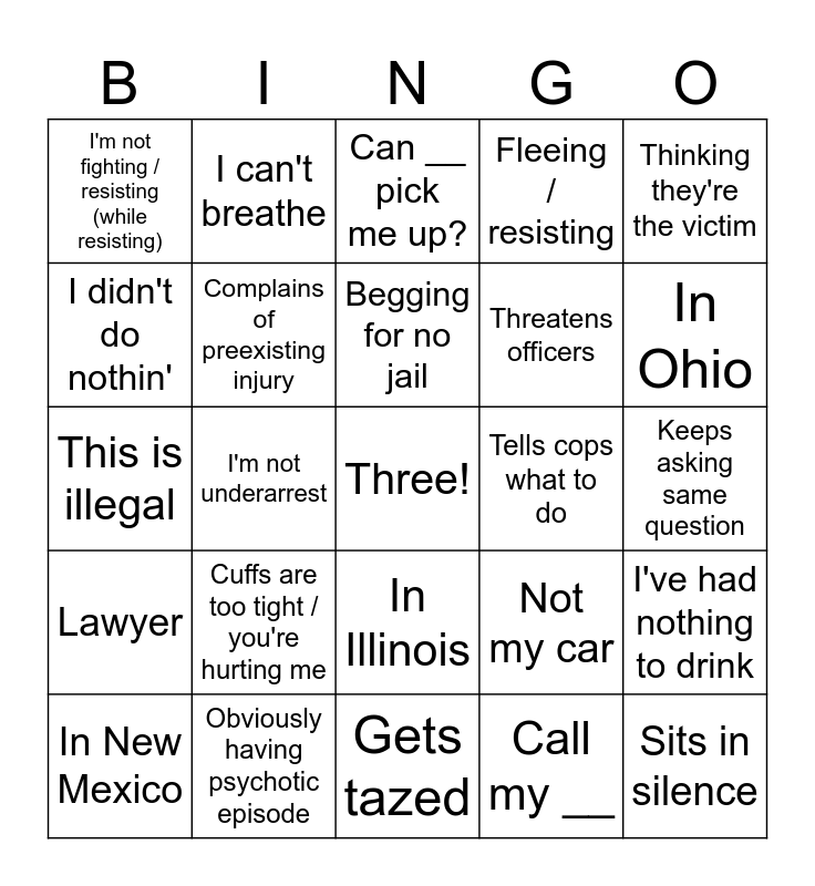This bingo card has a free space and 49 words: Don't have ID, Sits in silence, Suddenly Apologetic, Gets tazed, Cuffs are too tight / you're hurting me, Kill me / Take me to jail, I can't breathe, Assaulting officer, I didn't do nothin', I have right / know my rights, Complains of preexisting injury, Fleeing / resisting, I've had nothing to drink, Not my car, Shooting, Throws temper tantrum, Begging for no jail, Tells cops what to do, Car crash, Thinking they're the victim, I'm not underarrest, Call my __, I'm not fighting / resisting (while resisting), Threatens officers, In Wisconsin, In Ohio, In New Mexico, In Florida, In Illinois, Lawyer, Mentions Kids, Drugs, Obviously lying, Obviously drunk, Obviously having psychotic episode, Screaming SA, Insults officers, K-9, Keeps asking same question, Why am I being arrested, Gen Z stare, Entitled / priv, I have work tomorrow, On the phone, This is illegal, Can __ pick me up?, Can I talk to __ really quick, Pit and Failed stop sticks.