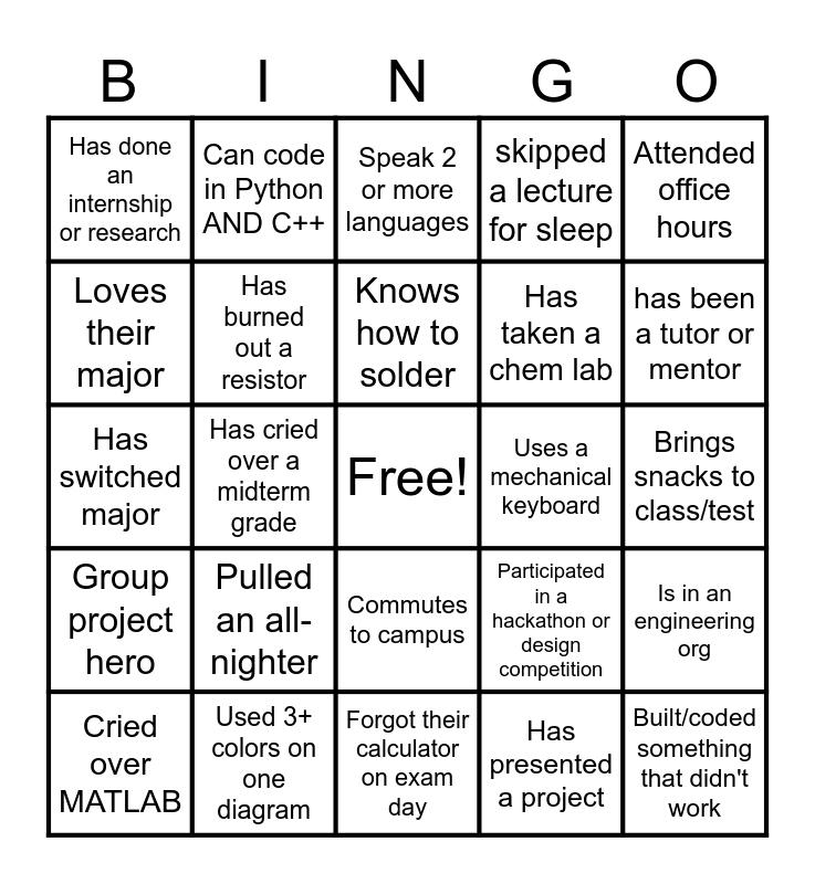 This bingo card has a free space and 24 words: Pulled an all-nighter, Used 3+ colors on one diagram, Knows how to solder, Cried over MATLAB, Attended office hours, Has done an internship or research, Loves their major, Can code in Python AND C++, Uses a mechanical keyboard, Commutes to campus, Has taken a chem lab, Has switched major, Participated in a hackathon or design competition, Is in an engineering org, Has burned out a resistor, Has presented a project, Brings snacks to class/test, Speak 2 or more languages, has been a tutor or mentor, Has cried over a midterm grade, Built/coded something that didn't work, Group project hero, skipped a lecture for sleep and Forgot their calculator on exam day.
