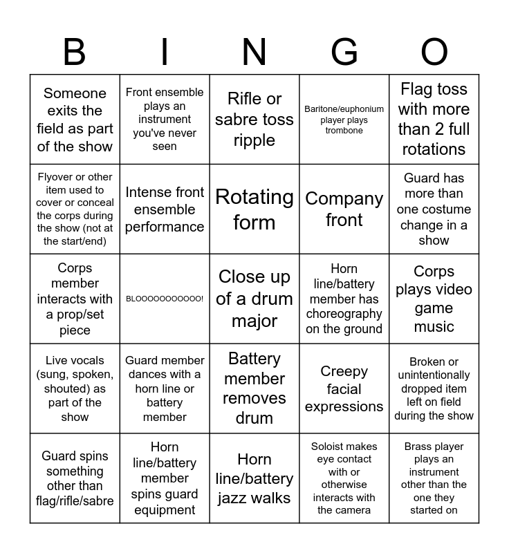 This bingo card has a free space and 44 words: Woodwind solo, Brass player plays an instrument other than the one they started on, Props larger than a person are moved around the field, Guard spins something other than flag/rifle/sabre, Someone winks at the camera, Soloist makes eye contact with or otherwise interacts with the camera, Rifle or sabre toss ripple, Flag ripple, Flag toss with more than 2 full rotations, Horn line/battery member spins guard equipment, Baritone/euphonium player plays trombone, Horn line/battery member has choreography on the ground, Battery member removes drum, Guard member dances with a horn line or battery member, Someone picks someone else up, Horn line/battery jazz walks, Tumbling pass (multiple skills chained together), Corps member interacts with a prop/set piece, Someone in the auditorium reacts loudly to something in a show, Guard has more than one costume change in a show, Front ensemble plays an instrument you've never seen, Saw something that can inspire my performance this season, Corps starts performing before they're announced (pre-show), Someone exits the field as part of the show, Hairography, Corps plays video game music, Corps plays movie music, Corps plays pop/rock music, Creepy facial expressions, Live vocals (sung, spoken, shouted) as part of the show, Horn line or battery has a costume change, Broken or unintentionally dropped item left on field during the show, Guard member spins more than one piece of equipment at a time, Props with lights, BLOOOOOOOOOOO!, Something went wrong and a performer recovered, Someone's step size is a 4 to 5 step or bigger, Visual ripple among the non guard members of the corps, Rotating form, Flyover or other item used to cover or conceal the corps during the show (not at the start/end), Company front, Horn line or battery members dance, Intense front ensemble performance and Weapon toss with more than 7 rotations.