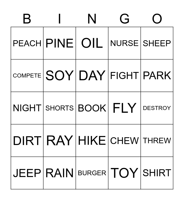This bingo card has a free space and 24 words: RAY, RAIN, DAY, JEEP, SHEEP, PEACH, COMPETE, PINE, FLY, HIKE, FIGHT, NIGHT, CHEW, THREW, SOY, TOY, DESTROY, OIL, PARK, SHORTS, SHIRT, DIRT, NURSE and BURGER.