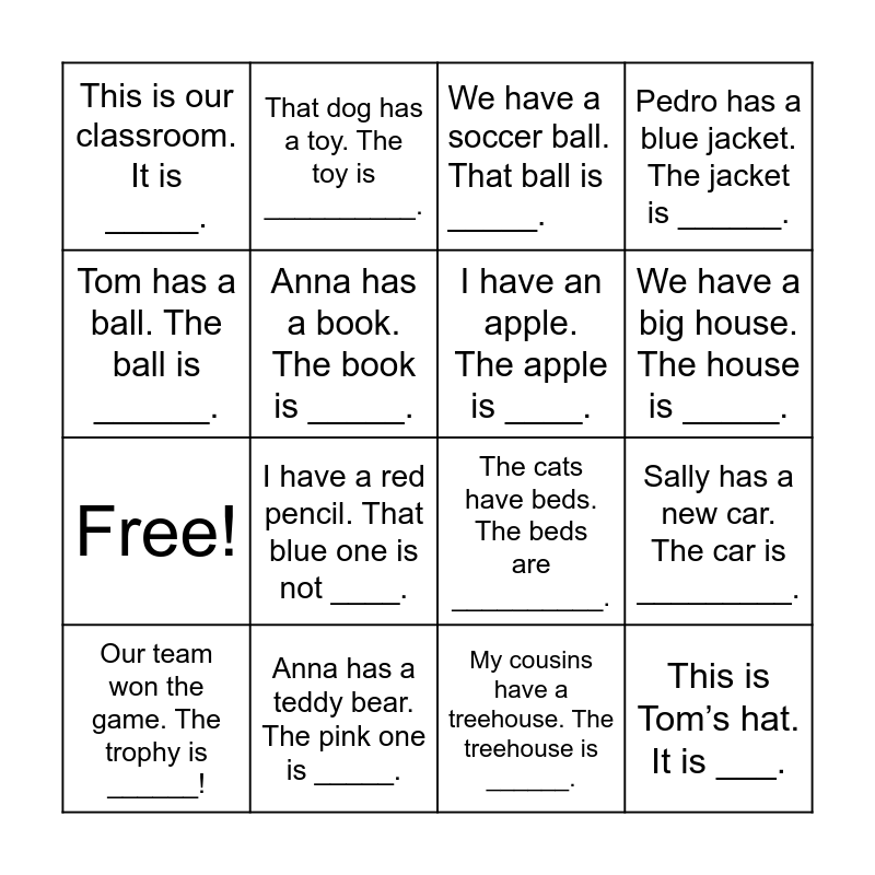 This bingo card has 20 words: Sally has a new car. The car is _________., This is my jacket. The jacket is _______., We have a soccer ball. That ball is _____., My friends have bikes. The blue bikes are ______., Our team won the game. The trophy is ______!, Tom has a ball. The ball is ______., Anna has a teddy bear. The pink one is _____., This is our classroom. It is _____., Free!, That dog has a toy. The toy is __________., I have a red pencil. That blue one is not ____., The cats have beds. The beds are __________., Anna has a book. The book is _____., This is Tom’s hat. It is ___., I have an apple. The apple is ____., The cat is eating. The food is _____., We have a big house. The house is _____., Pedro has a blue jacket. The jacket is ______., My cousins have a treehouse. The treehouse is ______. and Camila has a cat. The cat is ______..