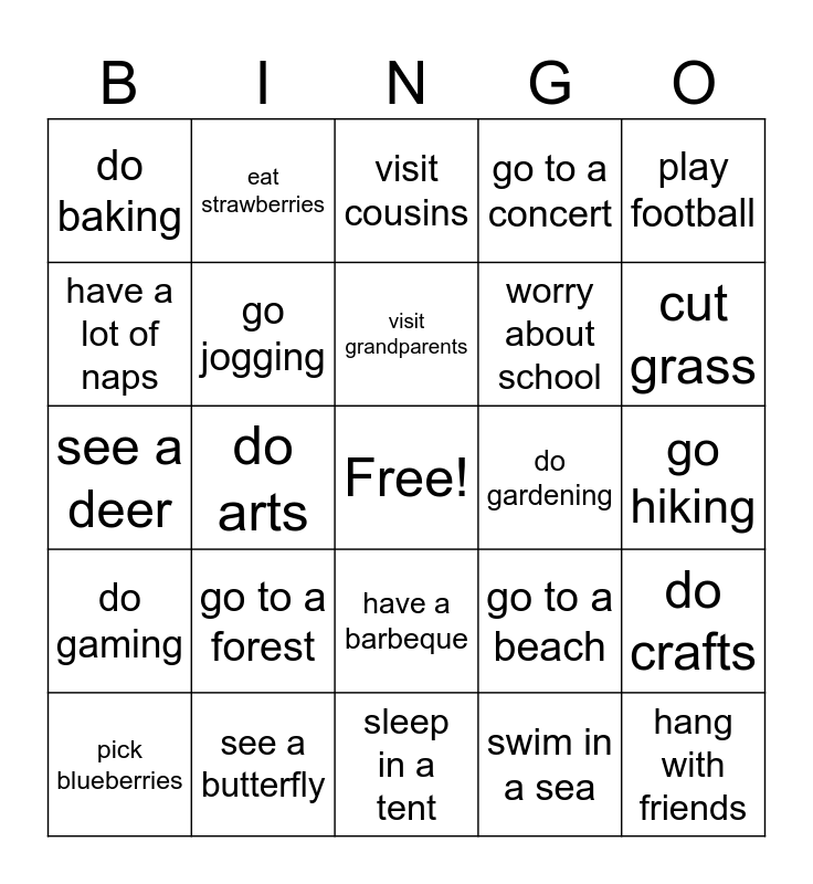 This bingo card has a free space and 34 words: eat ice cream, swim in a sea, swim in a lake, read a book, do gaming, go jogging, play football, pick blueberries, eat strawberries, go abroad, visit grandparents, visit cousins, have sleepover, pick flowers, do gardening, cut grass, see a butterfly, see a deer, go to a forest, go to a beach, have a barbeque, go to an amusement park, do baking, go hiking, sleep in a tent, hang with friends, go to a concert, go to a museum, worry about school, have a lot of naps, sleep in a hammock, do arts, do crafts and fix motor vehicles.