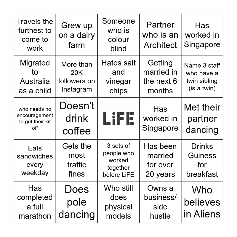 This bingo card has a free space and 24 words: Has completed a full marathon, Gets the most traffic fines, Hates salt and vinegar chips, Owns a business/ side hustle, Has worked in Singapore, Travels the furthest to come to work, Grew up on a dairy farm, Someone who is colour blind, Has worked in Singapore, Met their partner dancing, who needs no encouragement to get their kit off, More than 20K followers on Instagram, Has been married for over 20 years, Drinks Guiness for breakfast, Migrated to Australia as a child, Does pole dancing, Who still does physical models, Partner who is an Architect, Name 3 staff who have a twin sibling (is a twin), Eats sandwiches every weekday, Doesn't drink coffee, 3 sets of people who worked together before LiFE, Getting married in the next 6 months and Who believes in Aliens.