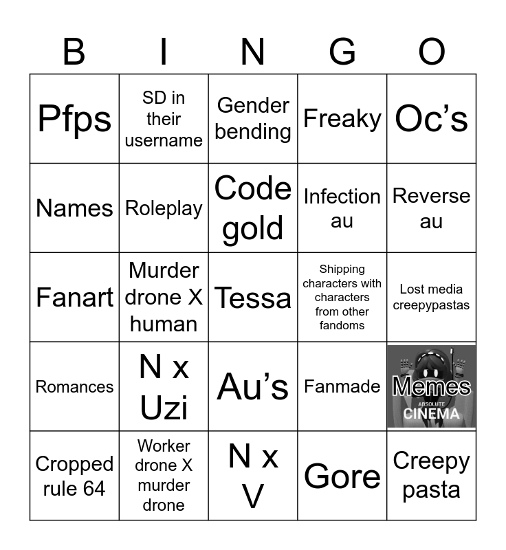 This bingo card has 1 images and 25 words: N x Uzi, N x V, Code gold, Cropped rule 64, Oc’s, Pfps, Names, SD in their username, Shipping characters with characters from other fandoms, Au’s, Infection au, Fanart, Fanmade, Memes, Roleplay, Creepy pasta, Lost media creepypastas, Gender bending, Reverse au, Murder drone X human, Tessa, Worker drone X murder drone, Romances, Freaky and Gore.