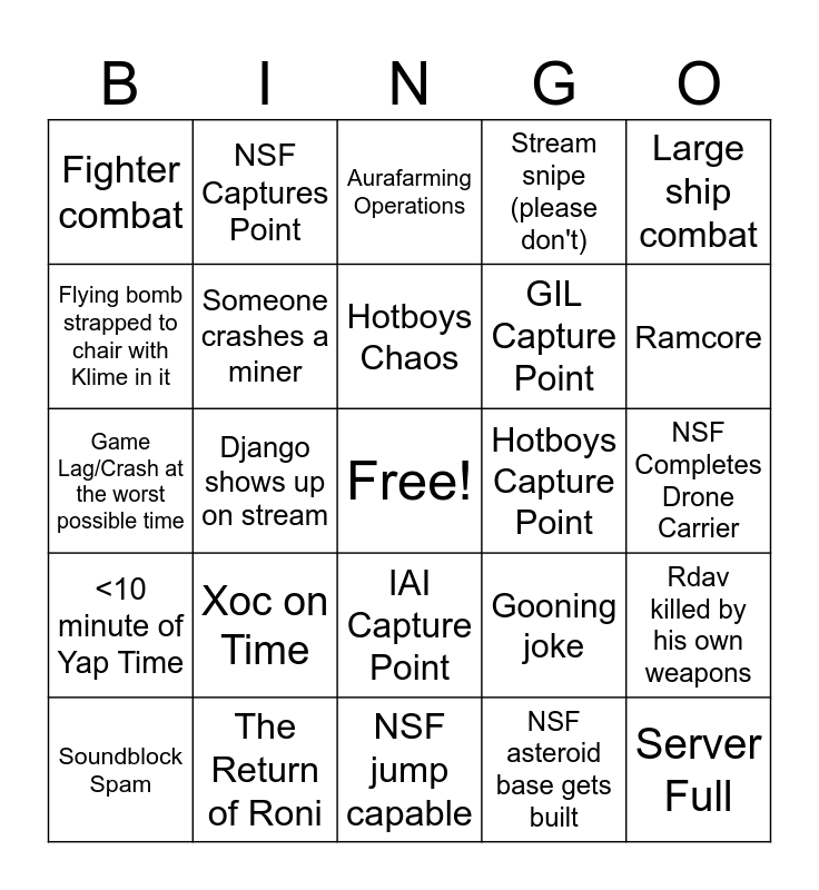 This bingo card has a free space and 24 words: Xoc on Time, The Return of Roni, Hotboys Chaos, Soundblock Spam, Large ship combat, Fighter combat, Flying bomb strapped to chair with Klime in it, NSF Captures Point, Hotboys Capture Point, IAI Capture Point, GIL Capture Point, Game Lag/Crash at the worst possible time, Gooning joke, Rdav killed by his own weapons, Someone crashes a miner, NSF asteroid base gets built, NSF Completes Drone Carrier, Aurafarming Operations, Ramcore, Django shows up on stream, Server Full, <10 minute of Yap Time, Stream snipe (please don't) and NSF jump capable.