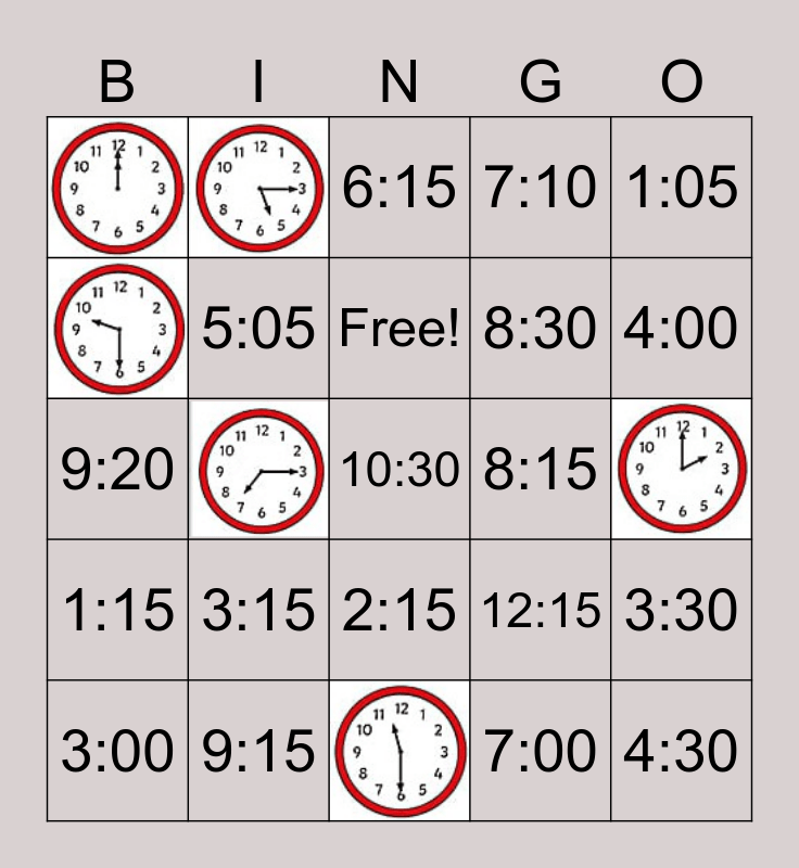 This bingo card has 7 images and 21 words: 3:30, 8:30, 7:00, 6:15, 1:15, 8:15, 3:00, 9:20, 7:10, 9:15, 4:00, 1:30, 3:15, 5:05, Free!, 2:15, 4:30, 10:30, 12:15, 1:05 and 3:25.