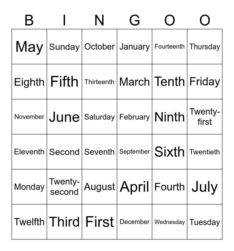 This bingo card has 36 words: April, August, December, Eighth, Eleventh, February, Fifth, First, Fourteenth, Fourth, Friday, January, July, June, March, May, Monday, Ninth, November, October, Saturday, Second, September, Seventh, Sixth, Sunday, Tenth, Third, Thirteenth, Thursday, Tuesday, Twelfth, Twentieth, Twenty-first, Twenty-second and Wednesday.